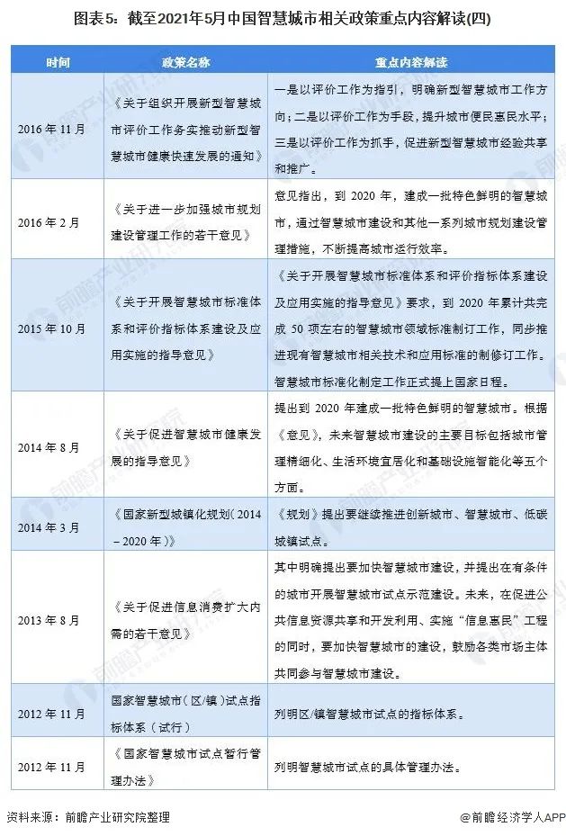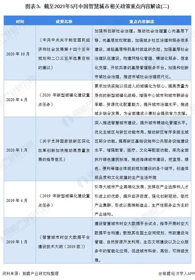 从整个政策文件中可以看出,各类文件分别从总体架构到具体应用等角度分别对智慧城市建设提出了鼓励措施,“加快”和“促进”是出现频度较高的关键词。截止2021年5月,我国智慧城市建设相关政策汇总如下: