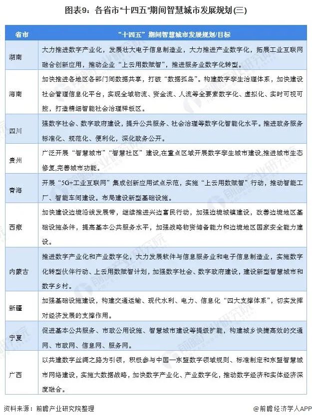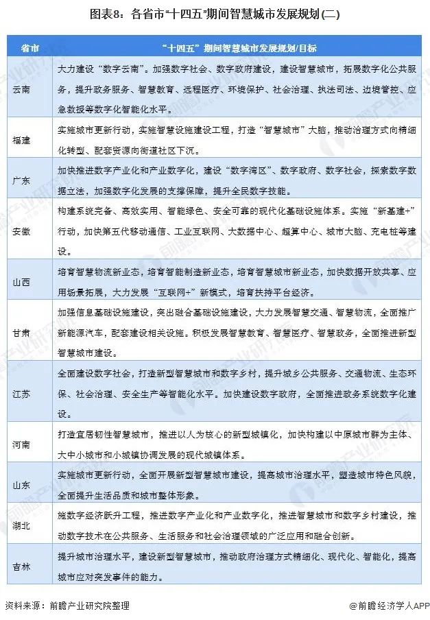 2021年,我国多地在“十四五”规划中指出,要加快智慧城市、新基建等规模部署,推进新技术等基础设施建设,推动传统基础设施升级,建设新一代信息基础设施体系。各省市智慧城市“十四五”规划中关于智慧城市的建设重点或任务如下: